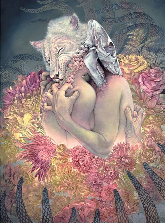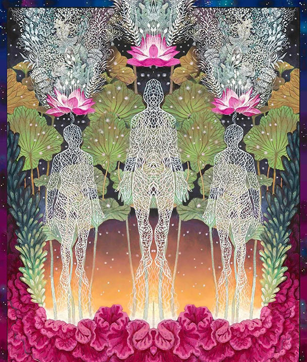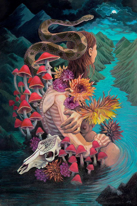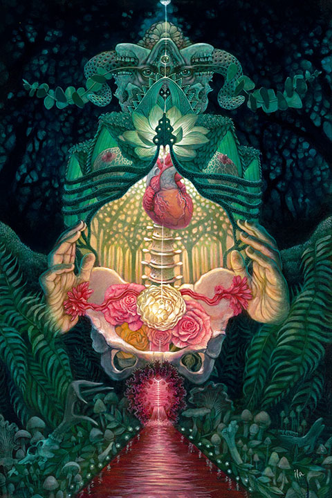 Rose is inspired and humbled by those who have formed close relationships with the earth. Instances of this human-environment interconnection are rich with symbolism. These archetypal symbols, as they echo throughout time and space, have instinctively landed themselves in ila’s art. She finds her work guides her, rather than the other way around. Science is important and fascinating to rose, who also honors the magic that lingers in that which is unknown and unprovable. With the painter’s tools, ila explores the limits of what we claim to know, and challenges the viewer to forge bravely on, into the mysterious realms of the infinite moment.