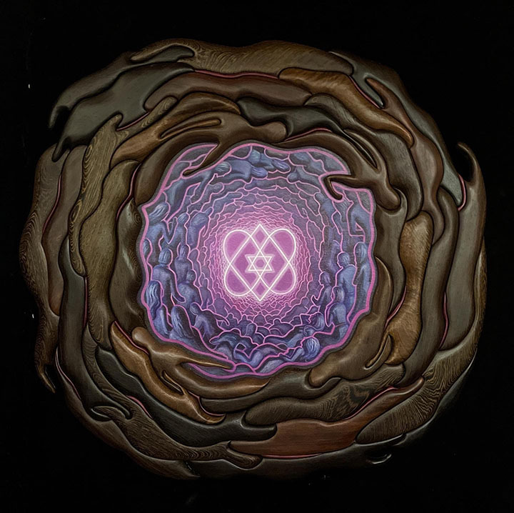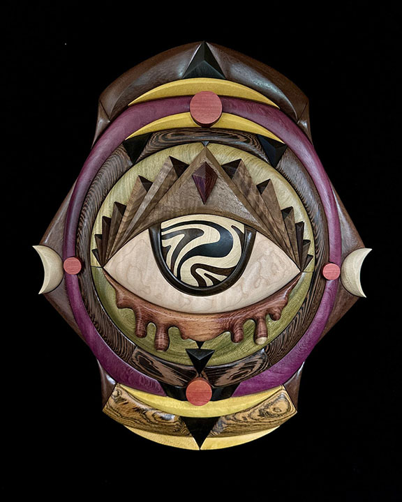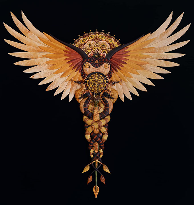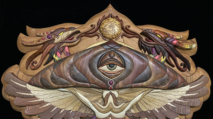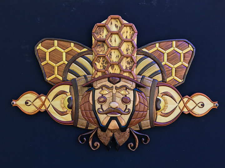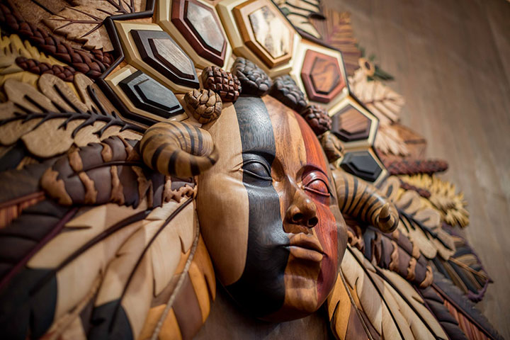 3 full time artists and 4 part time artists make up the current, but ever evolving wood vibe tribe. This team has honed and developed a technique for wood artistry that blends different known crafts, in a unique and exciting form. they blend carving and intarsia, with other woodworking skills. And have even begun large installation work, involving 3d software design, unique framework and small-scale prototyping. Working as a team, all members have influenced and shifted the process to what it is today, and this cooperation in craft has elevated these artists quickly in the ranks.