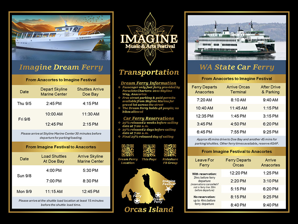 In an effort to make getting to Imagine easy, super fun and reduce the number of cars on-site, we offer a festival foot ferry direct from Paraclete Charters at Skyline Marina, Anacortes right to Orcas Island and Doe Bay! This saves you ferry wait times, cuts traveling and takes the stress out of dealing with the ferry schedule.